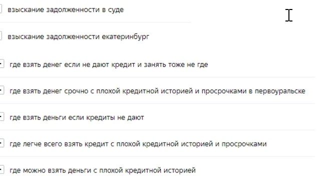 Ко мне обратилась юридическая фирма из Екатеринбурга, у них уже был опыт работы с Директом. Я зашёл в кабинет и вот что увидел. Это запросы, по которым реклама переводит людей на сайт по банкротству: